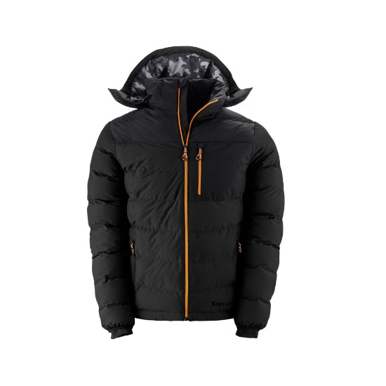 Tra i dettagli funzionali più apprezzati troviamo il cappuccio imbottito, regolabile e removibile, perfetto per adattarsi a ogni esigenza e situazione climatica. Le ampie tasche anteriori con chiusura a zip consentono di tenere a portata di mano strumenti e oggetti personali in modo sicuro, mentre la tasca al petto con zip aggiunge praticità senza compromettere lo stile. Il comfort è garantito anche nei movimenti, grazie ai polsini elastici e al fondo manica con bordo a costine che aderiscono bene al corpo evitando l’ingresso dell’aria fredda.